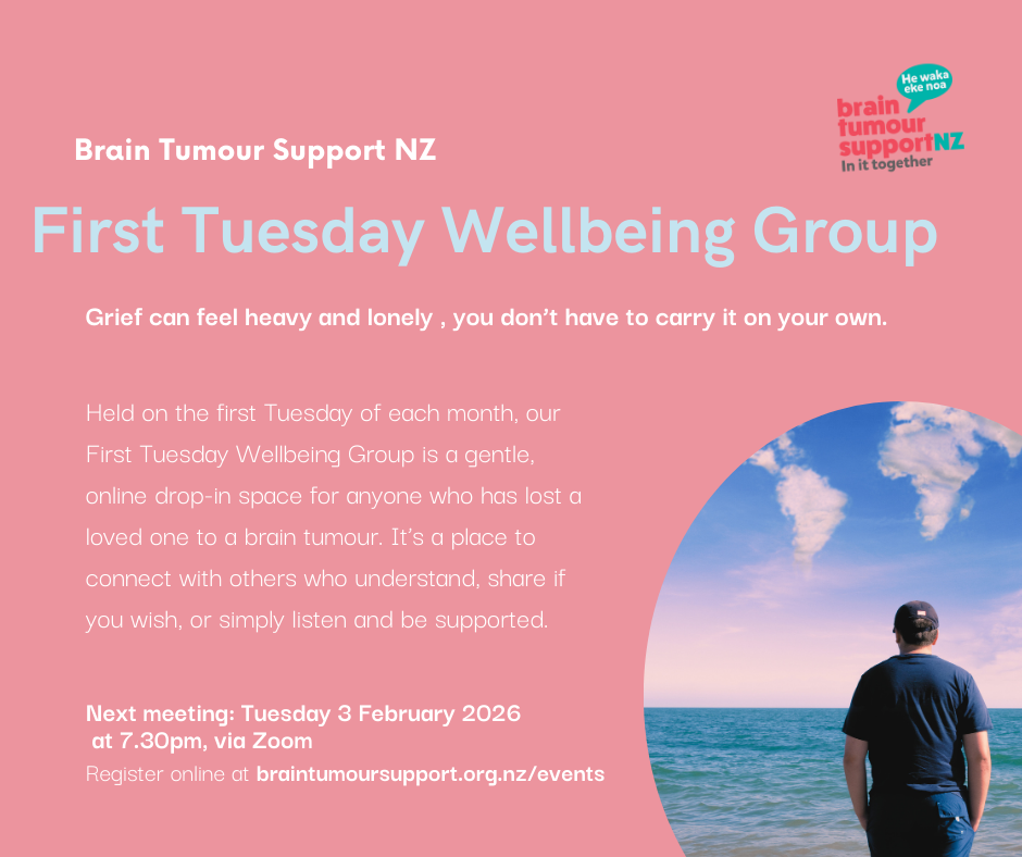 First Tuesday Wellbeing Group Meeting Tuesday, 3 February 2026 7:30 pm 8:30 pm Online via Zoom (map) Google Calendar ICS Our First Tuesday Wellbeing Group is a gentle, online drop-in space for anyone who has lost a loved one to a brain tumour. It’s a place to connect with others who understand, share if you wish, or simply listen and be supported. Register