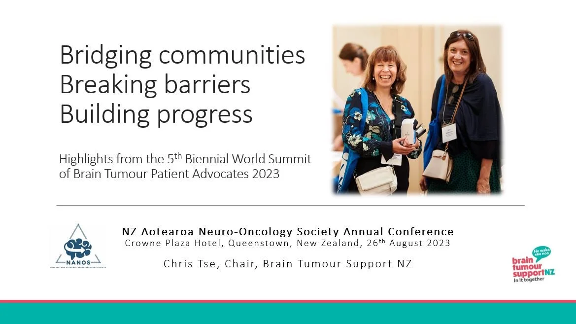 This presentation was delivered by Brain Tumour Support NZ chair, Chris Tse, at the 2023 Annual Conference of the NZ Aotearoa Neuro-Oncology Society (NANOS) on 26th August 2023 in Queenstown, NZ. Download the presentation here.