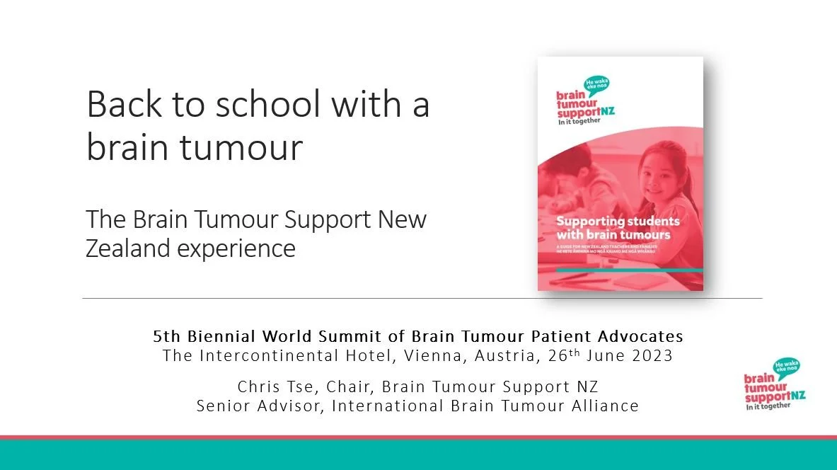 This presentation was delivered by Brain Tumour Support NZ chair, Chris Tse, at the Day 1 plenary session of the 5th Biennial World Summit of Brain Tumour Patient Advocates in Vienna, Austria, on 26th June 2023. Download the presentation here.