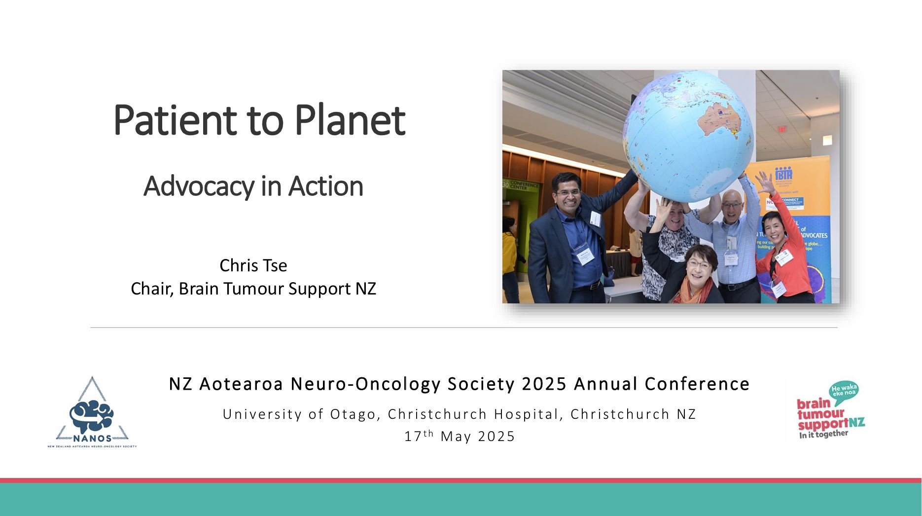 Presentation by BTSNZ chair Chris Tse at the NZ Aotearoa Neuro-Oncology Society (NANOS) 2025 Annual Conference, 17 May 2025, in Christchurch, NZ. Download the presentation here.