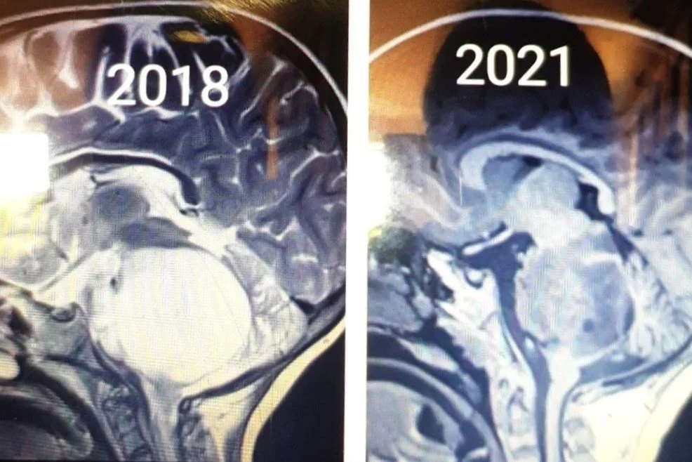 Elyse’s 2021 MRI scan showed significant shrinkage in the tumour compared with the scan done in 2018